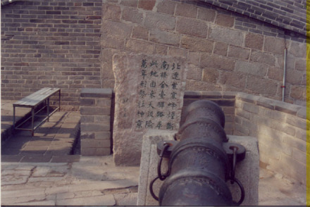 陳展于八達嶺關(guān)城內(nèi)登城入口處的馬道旁,共有五尊鐵炮,為當(dāng)時的先進武器之一。其中最大一尊炮筒長2.85米,口徑105毫米,射程達千米以上,威力甚大。炮身上刻有"敕賜神威大將軍"字樣,為明代崇禎十一年(1638年)制造。該炮是1958年從八達嶺東十余里的張堡地方運來的。另外四尊牛腿小炮,為1957年整修長城時的出土文物,同時還發(fā)掘出數(shù)百枚炮彈,均為明朝制品。據(jù)《武備志》記載:“古代以機發(fā)石,其機之木架,形如虎蹲。后來使用火炮,炮身短而粗大,以發(fā)開花彈者,名虎蹲炮,俗稱田雞炮”,由此可見當(dāng)時武器情況之強盛。