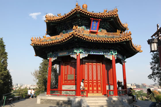 萬春亭:位于景山的中峰,中峰的相對(duì)高度為45.7米,是北京城南北中軸線上最高和最佳的觀景點(diǎn)。萬春亭位于景山最高處,建于乾隆十五年(1750年),是北京南北建筑中軸線的基點(diǎn)。被譽(yù)為北京中軸線上的制高點(diǎn),京華覽勝第一處。亭高15.38米,平面呈四方形,為三重檐四角攢尖頂,上檐和中檐均為九踩三昂斗拱,下檐為七踩重昂斗拱,黃琉璃瓦覆頂綠剪邊,檐上有琉璃寶頂,建筑面積296.5平方米。萬春亭的彩繪稱為:旋子大點(diǎn)金龍錦枋心,這也是中國(guó)皇家等級(jí)最高的彩繪形式。萬春亭內(nèi)供奉著“毗盧遮那佛”,毗盧遮那佛也稱為大日如來佛,是釋迦牟尼佛的法身。毗盧遮那佛為密宗金剛界五方如來之首,在五方佛中代表法界體性智。亭中所供原佛像于二十世紀(jì)六十年代被損毀,重塑歸安后于2000年正式對(duì)外開放。