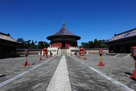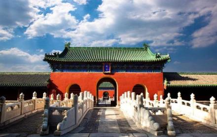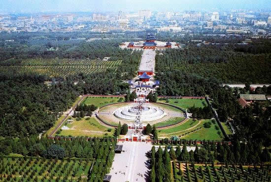 天壇公園由兩道壇墻環(huán)繞,被分為“內(nèi)壇”“外壇”兩部分;域北呈圓形,南為方形,寓意“天圓地方”;主要由春季祈禱豐年的“祈谷壇”,冬至日祭天的“圜丘壇”,皇帝祭祀前居住的齋宮、演習(xí)祭祀禮樂的神樂署四大古建筑群組成;祈谷壇中的祈年殿是北京市的標志性建筑。天壇公園外壇種植有大量古柏林。