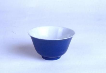 瓷質(zhì)。撇口,弧腹,深腹平底,圈足。器身外施祭藍釉,內(nèi)施白釉。純素。底書青花“大清光緒年制”六字雙行楷書款。