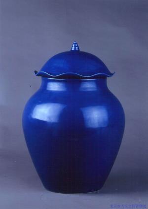 瓷質(zhì)。直口,平唇,短頸,豐肩,收腹,隱圈足。荷葉形蓋,子口,蓋上刻荷葉莖脈紋,螺鈕。器身外通施祭藍釉,器內(nèi)施白釉。純素。底書青花“大清光緒年制”六字雙行楷書款。