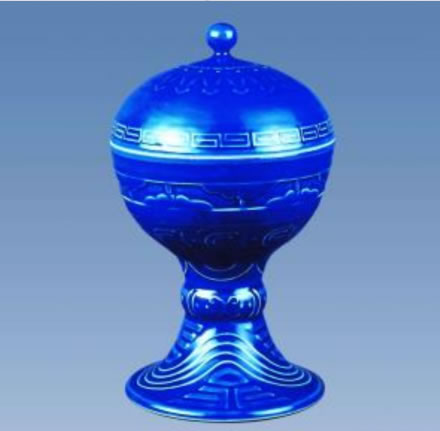 瓷質(zhì)。圓口平唇,弧腹,喇叭形高足中空。腹依次為垂云紋、回紋,校圍波紋、金鈑紋,足為波帶黻紋;⌒紊w,珠鈕,子口。蓋上飾星紋、垂云紋、回紋。器身外通施祭藍釉,器內(nèi)施白釉。足內(nèi)白釉。