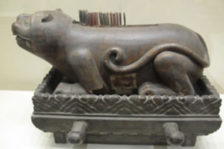 為中和韶樂樂器,“八音”中木制樂器,用于止樂。伏虎狀,背上列齟齬,趺三層,列崇牙,旁飾兩耳,用以置籈。中和韶樂中設(shè)柷、敔各一,分別由一人演奏。作樂時,舉麾則擊柷三聲,樂曲即開始。樂曲結(jié)束時,用籈逆刮虎背木齒三聲,樂曲即結(jié)束。