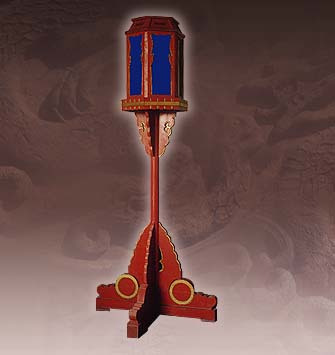 通高191厘米,燈罩邊長34厘米,托座邊長50厘米,高55厘米,寬42厘米,攢頤尖頂高8.5厘米,寬34厘米,六棱。底座長79厘米。座燈由燈罩、底座兩部分組成,燈罩六棱,上收,平頂,每面鑲透明玻璃。底座上以圓立柱支撐托座,以承燈罩。底座四歧呈十字形。通身紅色金緣。插燈與座燈同,只是底座插在石礎(chǔ)內(nèi),置于殿內(nèi)及路側(cè)。