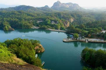 九龍湖景區(qū)左起云霄巖,右連竹安寨,面積10.84平方公里,湖水碧波蕩漾,幽深湛蘭,庫(kù)區(qū)水路迂回曲折,兩岸丹霞山巒陡峭,山奇水秀,遠(yuǎn)看湖上群山如游龍戲水,近觀(guān)壩下湖水如玉女散珠。