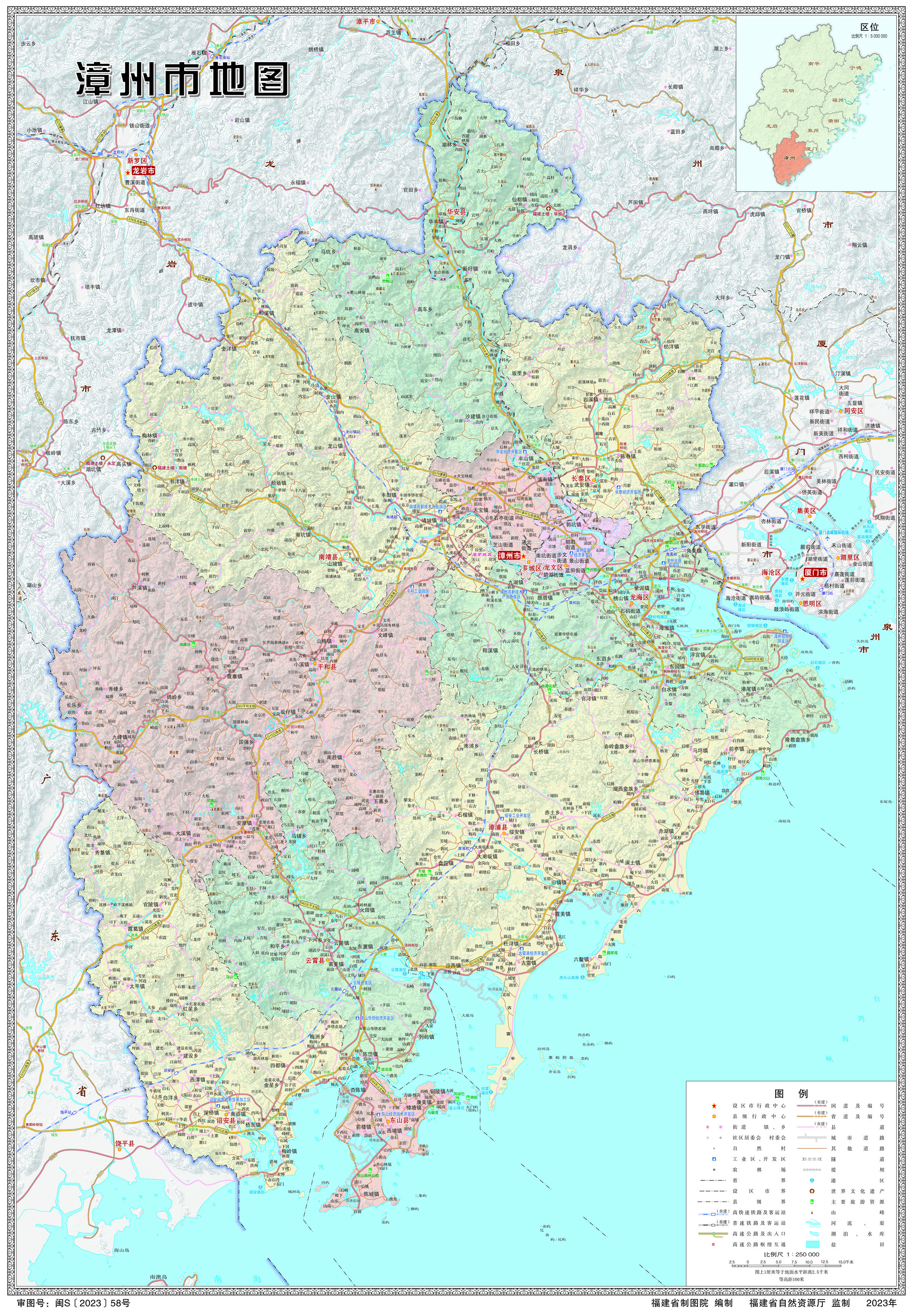漳州南部的龍海、漳浦、云霄與詔安4縣瀕海,東山原為一島縣,20世紀60年代初建成八尺門海堤后,已有陸路與大陸相通,成為人工半島。海岸線曲折,多港灣,從九龍江口至詔安與廣東饒平的海岸分界點,海岸線總的走向呈北東向,正面寬約128千米,海岸線長631千米。有12個較大海灣與河口灣。海岸類型齊全,有巖岸、泥岸、沙岸和河口平原海岸,以及人工海岸。轄區(qū)內(nèi)有502個島嶼礁石。