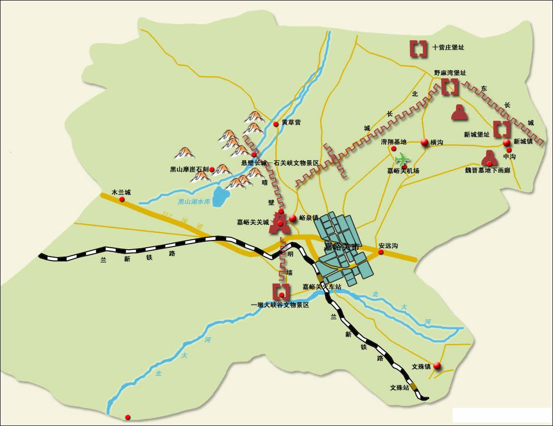 長(zhǎng)城第一墩、懸壁長(zhǎng)城、黑山淺石刻巖畫、長(zhǎng)城博物館、魏晉墓地下畫廊、七一冰川),為旅游業(yè)的發(fā)展奠定了資源基礎(chǔ)。