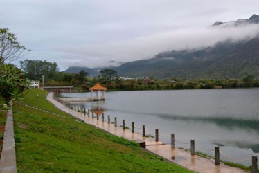 白水寨地處降雨頻密的增城北部山區(qū),充沛的降雨量不僅造就了中國(guó)內(nèi)陸第一高瀑的氣勢(shì)磅礴,也為白水寨帶來(lái)了美不勝收的湖泊風(fēng)光。瀑布從428.5米的山上飛流直下,氣勢(shì)磅礴,蔚為壯觀。瀑布源頭蒼翠、險(xiǎn)峻的群山環(huán)抱,仙姑天湖和七仙湖就像碧綠的翡翠般鑲嵌在層林疊翠間,這兩個(gè)大型的高山湖泊總?cè)萘窟_(dá)480萬(wàn)立方米。在白水寨山下,瀑布流水又匯聚成一個(gè)天然的湖泊。湖水清澈,晶瑩如玉,晴朗之際,湖面宛若明鏡,將旁邊的青山密林、綠草紅花倒映其中,美不勝收。