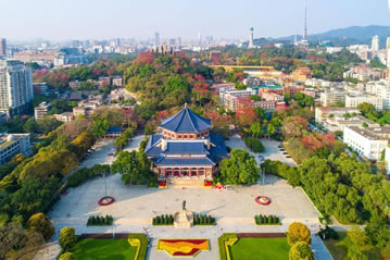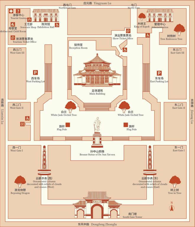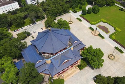 從空中俯視,紀念堂呈外突的傘型結(jié)構(gòu),青磚藍瓦藍象征著孫中山先生當年。