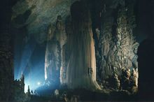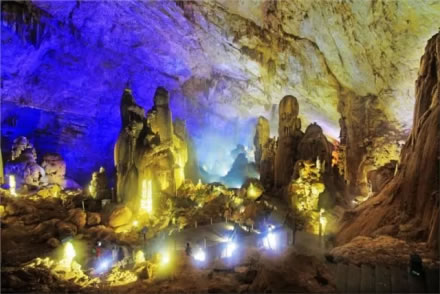 積七萬多平方米,最寬處達一百七十五米,最高處一百五墕主。洞內(nèi)地勢起伏,石峰叢立,如重巒疊嶂,山間常有云霧繚繞。有金色塔山、成林玉樹,還有螺旋狀的高大石柱“螺旋樹”。