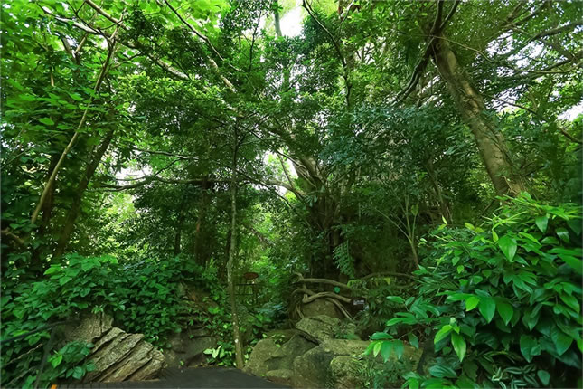 雨林谷以展現(xiàn)原生態(tài)的熱帶雨林景觀為核心,匯集參天巨榕、百年古藤、黑桫欏、仙草靈芝、見血封喉、野生桄榔以及“高板根”“根抱石”“空中花園”“老莖結(jié)果”“植物絞殺”“藤本攀附”熱帶雨林的六大奇觀等。雨林谷是“天然氧吧”和負(fù)氧離子發(fā)生器,此地年平均溫度24度。雨林谷游覽通道由木棧道、野趣石階、吊橋組成,長達(dá)3.5千米,分為大、中、小三個(gè)環(huán)行線路。