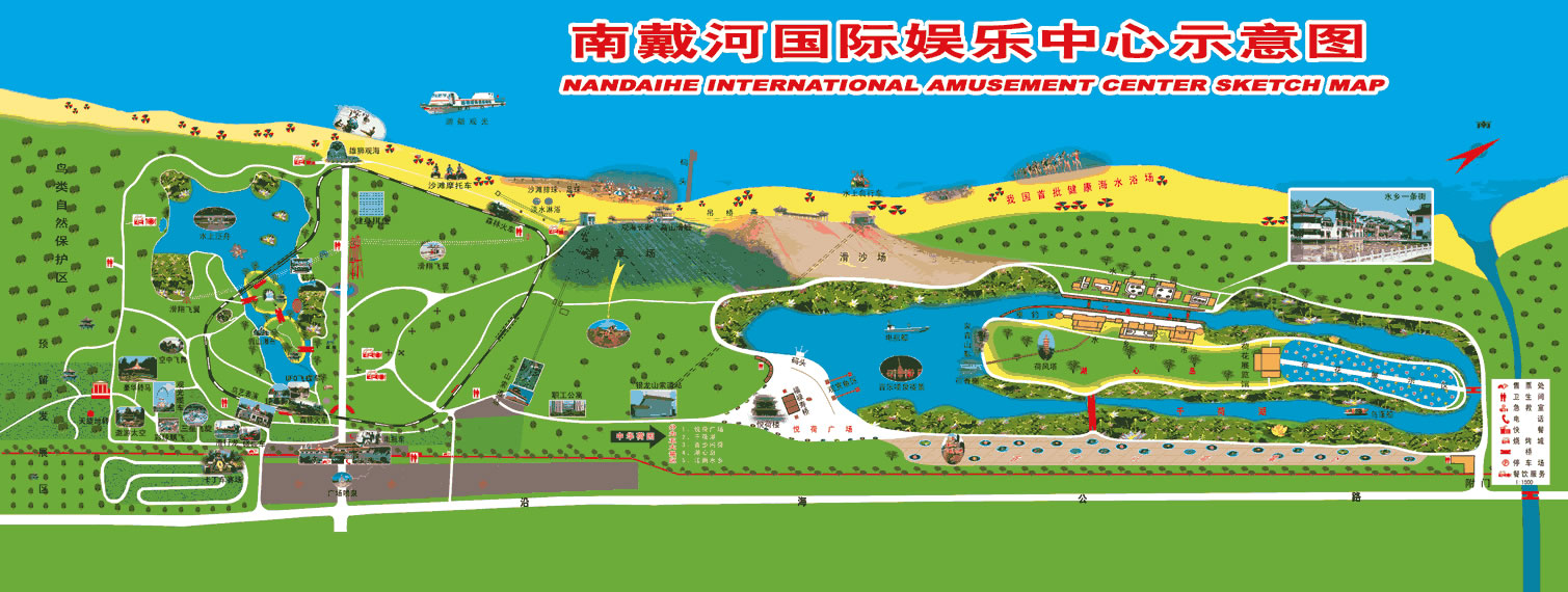 南戴河國際娛樂中心包含歡樂大世界、碧海金沙、金龍山、中華荷園、槐花湖五大區(qū)域。這里遠離污染,環(huán)境清幽,空氣清新,植被蔥郁,完全具備了當(dāng)今國際海岸旅游的五大要素:海洋、沙灘、陽光、空氣、綠色。