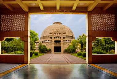 印度佛殿苑方正嚴(yán)謹(jǐn),中心是一個巨大的覆缽式穹窿頂,佛殿下水流往來,噴涌不斷;佛殿外回廊環(huán)繞,靜謐整齊。一座具有印度古典風(fēng)格的佛教建筑,與中國傳統(tǒng)的佛教寺院并立,她是中印兩國人民世代友好的象征。