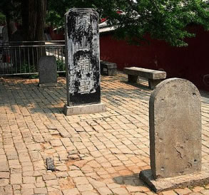 過了山門,便是甬道。甬道兩旁就是蒼松翠柏掩映下的碑林,因碑石如林故稱碑林。這里共有20多通歷代石碑,如“宗道臣?xì)w山紀(jì)念碑”、“息息禪師碑”等。在道路東側(cè)有一長廊,廊內(nèi)陳列有從唐代到清代的名碑100多通,有碑廊之稱。錘譜堂就在山門內(nèi)碑林西側(cè),里面有泥塑和木雕群像。