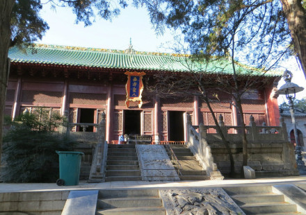 大雄寶殿位于天王殿后。大雄寶殿是寺院佛事活動的中心場所,與天王殿、藏經(jīng)閣并稱為三大佛殿。原建筑毀于民國十七年(1928年),1986年重建。殿內(nèi)供釋迦牟尼、藥師佛、阿彌陀佛的神像,殿堂正中懸掛康熙皇帝御筆親書的“寶樹芳蓮”四個大字,屏墻后壁有觀音塑像,兩側(cè)塑有十八羅漢像。殿內(nèi)供奉著釋迦牟尼、阿彌陀佛、藥師佛的神像,屏墻后面懸塑觀音像,兩側(cè)有十八羅漢侍立。大雄寶殿東側(cè)的殿宇是緊那羅殿,重建于1982年。