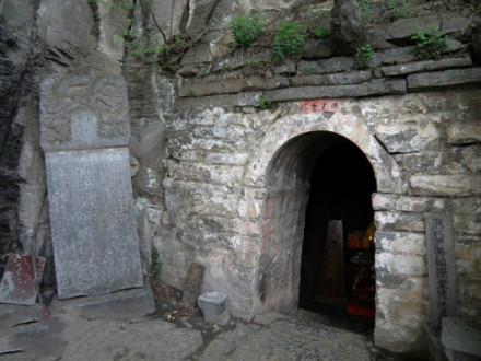 在少林寺背后五乳峰中峰上部有一天然石洞,為當(dāng)年達(dá)摩祖師九年面壁處,稱為達(dá)摩洞。禪宗初祖達(dá)摩于公元527年到536年在此洞面壁靜坐長達(dá)9年。達(dá)摩洞面向西南,洞口用青石塊砌成拱門,洞深約七米,高寬各三米余。洞內(nèi)臺上有石像三尊,中為達(dá)摩坐像,兩側(cè)為其弟子。