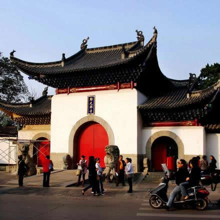 山門為古典式的八字門形式建筑,朝陽而開,象征吉祥。歸元禪寺山門前的石獅,連座共高2.3米,原鎮(zhèn)守在漢陽縣衙、府衙門前,是明代遺物。武漢解放之后,漢陽顯正街的衙門撤銷,信眾將被棄下的石獅合力搬到了歸元禪寺。