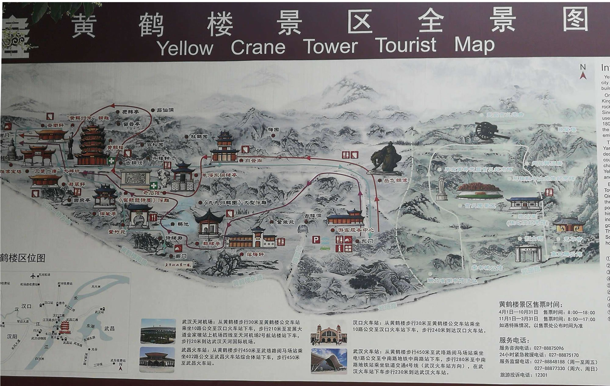 塔、碑廊、山門等建筑。整個建筑具有獨特的民族風格。黃鶴樓內(nèi)部,層層風格不相同。底層為一高大寬敞的大廳,其正中藻井高達10多米,正面壁上為一幅巨大的“白云黃鶴”陶瓷壁畫,兩旁立柱上懸掛著長達7米的楹聯(lián):爽氣西來,云霧掃開天地撼;大江東去,波濤洗凈古今愁。二樓大廳正面墻上,有用大理石鐫刻的唐代閻伯瑾撰寫的《黃鶴樓記》,它記述了黃鶴樓興廢沿革和名人軼事;樓記兩側為兩幅壁畫,一幅是“孫權筑城”,形象地說明黃鶴樓和武昌城相繼誕生的歷史;另一幅是“周瑜設宴”,反映三國名人去黃鶴樓的活動。三樓大廳的壁畫為唐宋名人的“繡像畫”,如崔顥、李白、白居易等,也摘錄了他們吟詠黃鶴樓的名句。四樓大廳用屏風分割幾個小廳,內(nèi)置當代名人字畫,供游客欣賞、選購。頂層大廳有《長江萬里圖》等長卷、壁畫!