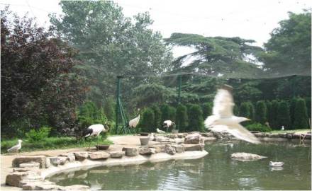 鶴園于1999年建成,面積600余平方米。2006年將原網(wǎng)罩改為不銹鋼網(wǎng)棚。該園采用不銹鋼網(wǎng)架構(gòu),配以豐富的植物,動(dòng)物表現(xiàn)自然,參觀視覺通透。展出動(dòng)物有丹頂鶴、白鸛、白鹮、銀鷗等。