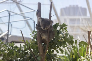 考拉館占地面積1400平方米,建筑面積600平方米,內(nèi)展廳、外展區(qū)、陽光溫室展區(qū)、體檢區(qū)、動(dòng)物隔離治療區(qū)、桉樹冷藏室、桉樹處理區(qū)、人員進(jìn)出消毒池和更衣區(qū)和游客互動(dòng)體驗(yàn)區(qū)等功能區(qū)俱全。展廳具有溫度、濕度控制系統(tǒng),游客區(qū)和考拉生活區(qū)兩套完全獨(dú)立的新風(fēng)系統(tǒng)進(jìn)行環(huán)境控制,確保游客面空氣循環(huán)與考拉籠舍空氣循環(huán)不交叉。