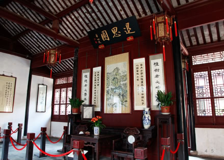 主建筑仿明代結(jié)構(gòu),俗稱“紗帽廳”。因梁頭棹木像明代官帽的帽翅,故名。該庭院高大寬敞,肅穆莊重。五架梁兩側(cè)中心刻有“八駿圖”,梁兩端刻有“鳳穿牡丹”。梁底則刻有“稱心如意”、“必定高中”等圖案。“紗帽翅”(即梁頭棹木)上刻有《三國演義》中的“古城會(huì)、三英戰(zhàn)呂布”等八幅戲文透雕,形象逼真,呼之欲出。這組透雕被《中國戲曲志·蘇州分卷》收錄。