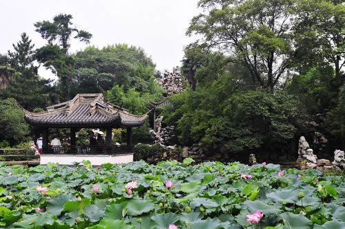 春秋閣東南下,有面闊五間、平挑入水、半架河上、前設(shè)半亭的水榭。延伸處有貼水平臺(tái),三面圍以欄桿,中開方洞,露出水面一方,名“問魚淵”。時(shí)見小魚悠游,伸手可掬。水榭中間,由費(fèi)新我書“層波疊影”額。水榭連廊,穿過春秋閣直通數(shù)魚檻,其中一段架于水面,故名“水旱廊”。數(shù)魚檻緊倚千步長廊,面闊七間,臨水而筑,池對(duì)面建有半亭,是從西水仙廟遷來。密密斗拱托撐飛檐之頂,古色古香。穿亭向前,有延伸入池的半島,上建六角攢尖的“綠漪亭”。 假山群在蠡園入口和“層波疊影”之間。一大片湖石堆疊而成的奇峰,嶙峋多姿,氣勢不凡。一條石徑,盤旋曲折,忽高忽低,忽寬忽狹,忽明忽暗。置身其間,聞聲不見人,可望不可即,如入迷宮。假山都以“云”字為題,有“云窩、云腳、穿云、朵云、