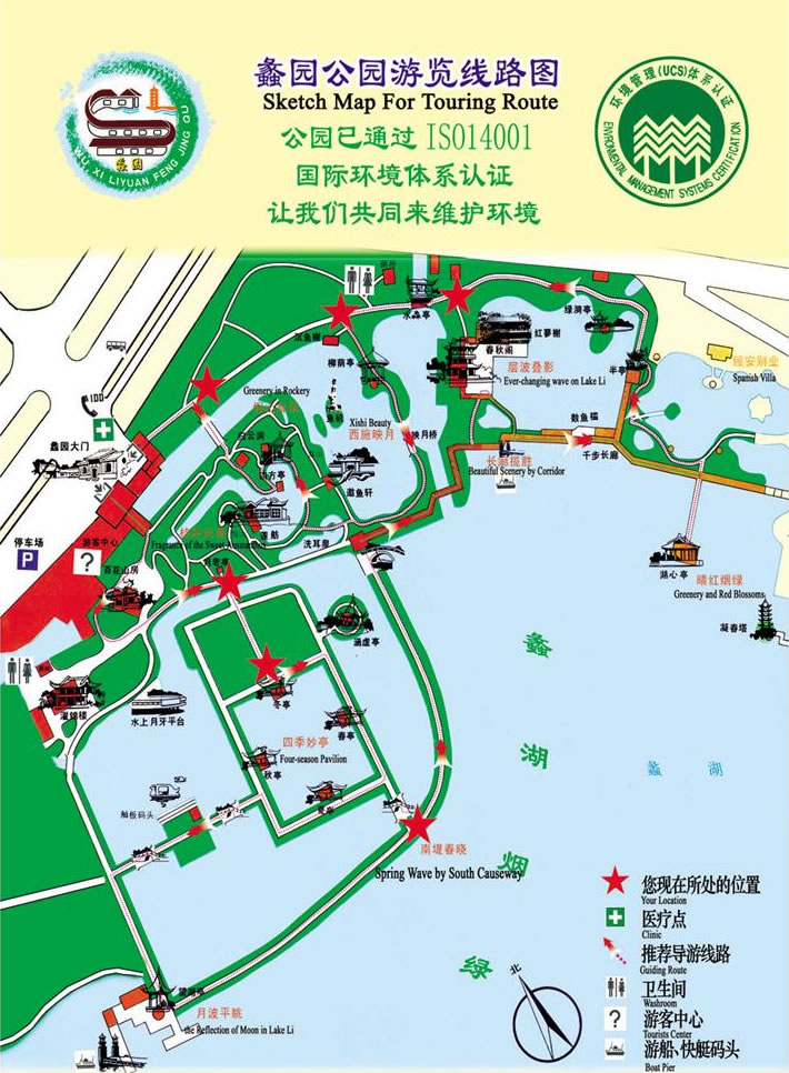 盤云、歸云、留云”之名。高12米的歸云峰為假山群峰之巔。游人聚立其上,極似寺廟中的大壁塑——山海佛像圖。假山之南,有池水縈繞,其中停泊著一艘建于1930年的“蓮舫”。碧波與假山間有古軒。向南有“洗耳泉”,泉井徑米許,狀如耳孔,周圍湖石疊成耳廊狀。泉西,有數(shù)十株丹桂,題稱“桂林天香”。 1995年國家郵電部發(fā)行的《太湖·蠡湖煙綠》和1996年朝鮮發(fā)行的《太湖》郵票,都將蠡園作為其主景。郵票被譽(yù)稱“國家名片”,上述兩枚郵票的發(fā)行,更使蠡園遐邇聞名。