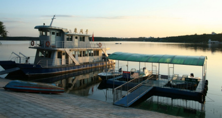 凈月潭水上游覽船舶集水上交通運(yùn)輸、游覽于一體。從任何一處碼頭上船都可以通向風(fēng)景區(qū)的幾個(gè)主要景點(diǎn):大壩碼頭、沙灘浴場(chǎng)碼頭、橡樹灣碼頭(森林浴場(chǎng))、滑雪場(chǎng)。凈月潭現(xiàn)有兩艘主要船舶。其中“乘風(fēng)號(hào)”游船系雙層雙體燃?xì)猸h(huán)保型游覽船舶,定員 100位。游客可在乘坐游船的同時(shí)觀賞凈月潭水的秀色。而“麒龍?zhí)枴笔且凰椰F(xiàn)代船舶,客艙內(nèi)配有電視、音樂(lè),為游客播放凈月潭相關(guān)視頻,二層甲板處更是觀光遠(yuǎn)眺凈月風(fēng)景的好地方。凈月潭又從日本購(gòu)進(jìn)多輛三座位的“水上摩托艇”,速度快、較刺激,可供游客自行駕駛。由“摩托艇”牽引,游人還可踩滑水板滑翔于潭面。由“快艇”牽引,乘坐五座位的火箭沖浪艇,也極具刺激性。