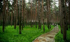 森林浴場(chǎng)種植了4萬(wàn)平萬(wàn)米的樟子松林,樟子松特點(diǎn)是樹干底部為灰黑色,上部為紅褐色,外形比較美觀,與長(zhǎng)白山的美人松很相像,屬于常綠喬木,最高可達(dá)30 米,耐寒性和適應(yīng)性都很強(qiáng)。這樣完美整齊的樟子松林,在國(guó)內(nèi)都屬罕見(jiàn)。橫穿森林浴場(chǎng)的小路是由冰片石鋪成的,取材遼寧本溪,是一種帶有蕨類植物的化石。