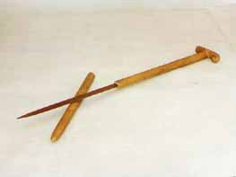 拐杖刀:俗稱“二人奪”,長約90厘米。表面上看呈拐杖型,木質(zhì)。但實(shí)際上,其前面是可以斷開的,拔出外鞘,里面是一個刺刀。這是抗日斗爭初期,東滿游擊隊和當(dāng)?shù)厝罕娪脕韺Ω稊橙说拿孛芪淦。是?dāng)時很流行很實(shí)用的武器。