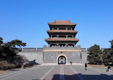 第三部分:方城、寶城、月牙城。與碑亭相對(duì)的就是隆恩門,過了隆恩門就是方城了,它是昭陵的主體建筑,隆恩殿居于其中,后面是明樓,左右有配殿,四邊有角樓。過了明樓,是寶城,它下面就是葬有皇太極夫婦的地宮。