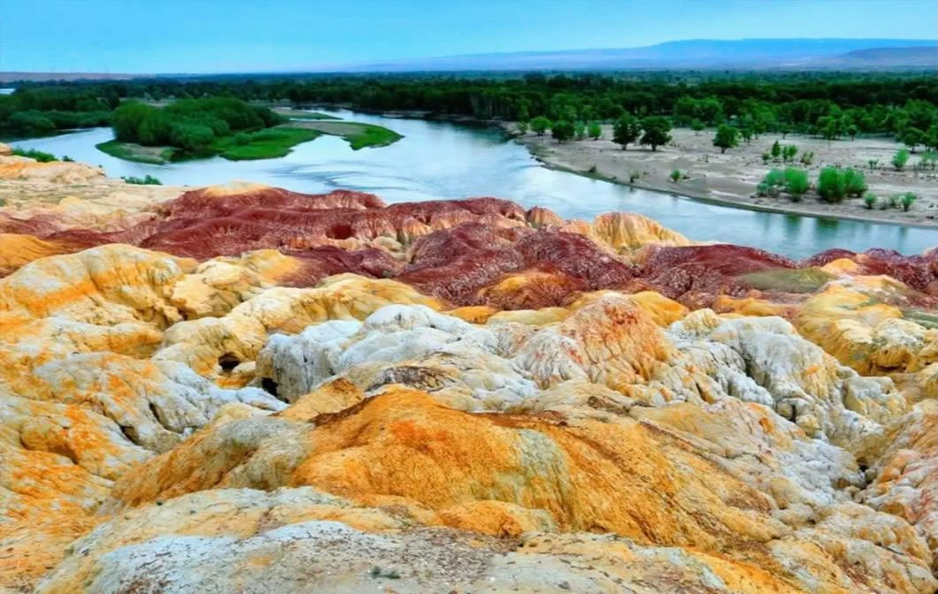 - 特色:以“一河隔兩岸”奇觀聞名——北岸雅丹地貌色彩斑斕(紅/綠/紫/黃/棕),南岸河谷綠洲森林茂密,額爾齊斯河穿流其間,形成“半邊火焰半邊森林”的魔幻畫面。