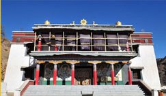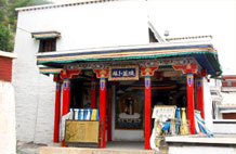 原名努尼殿,是供僧人靜坐休持的殿,用于喇嘛們以逐漸減少飲食,靜坐默誦,力圖不食不語(yǔ)的修行方式去解脫超度眾生靈。后來(lái)毀于文革動(dòng)亂。2003年國(guó)家撥款在遺址上恢復(fù)并擴(kuò)建此殿,2005年9月開(kāi)始對(duì)外開(kāi)放,全殿上下兩層,一樓為佛堂,供有千手千眼觀音像、六世班禪大師、宗喀巴大師像,正中供奉的三世佛為銅鑄鍍金佛像。墻上所繪壁畫是藏傳佛教九大佛寺壁畫。
