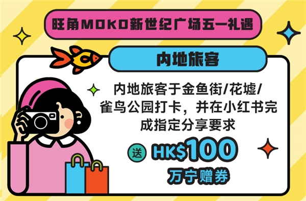 針對游客需求的變化,香港政府推出相關扶持政策,以支持區(qū)域特色打卡發(fā)展。以香港最著名的旅游區(qū)、購物區(qū)和美食區(qū)旺角為例,為了迎接內地游客,香港政府在金魚街、花墟、雀仔公園設置不同打卡裝置。當地的商場也通過各種舉措歡迎內地游客。旺角地標MOKO新世紀廣場面向內地游客推出專享優(yōu)惠“日夜打卡繽紛禮”,于以上景點打卡分享到小紅書社交媒體及完成指定要求,可免費領取總值100港幣的萬寧贈券一份,一鍵PO出雙倍快樂。
