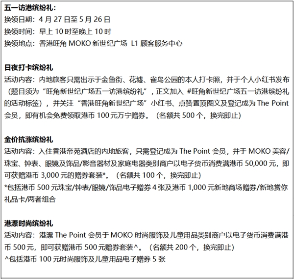 有關香港旺角MOKO新世紀廣場五一推廣活動詳情