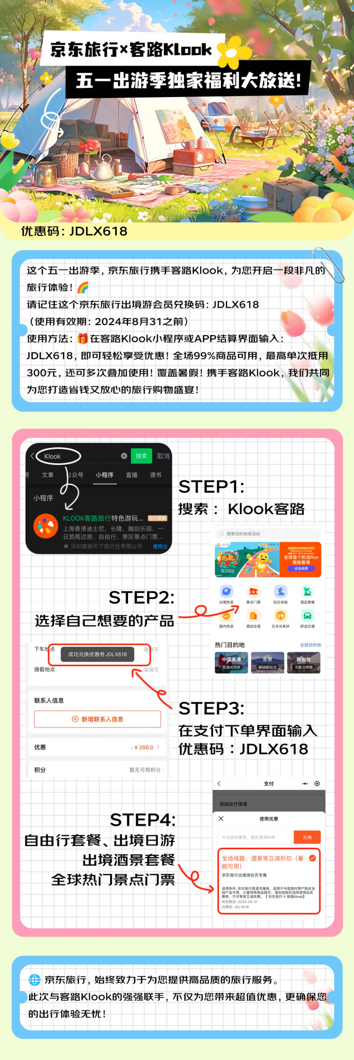 目前,中國已和23個國家實現(xiàn)全面互免簽證。相關平臺數(shù)據(jù)顯示,今年“五一”出境游熱度飆升,新近免簽的新馬泰更是熱門之選。泰國曼谷芭提雅6日游,帶你去曼谷逛大皇宮、芭提雅看人妖表演、沙美島出海,還提供五星酒店住宿、泰式美食盛宴等,僅5199元起。想自由行,推薦4759元起的馬來西亞吉隆坡6天5晚游,包含北京直飛往返機票以及1晚網(wǎng)紅酒店住宿。值得關注的是,京東旅行還攜手專注于境外目的地的旅游體驗預定平臺客路Klook送上獨家福利。消費者在Klook小程序或者APP下單任何產(chǎn)品,輸入優(yōu)惠碼JDLX618,單次下單享至高300元優(yōu)惠,覆蓋全場99% 商品,且可多次疊加使用。