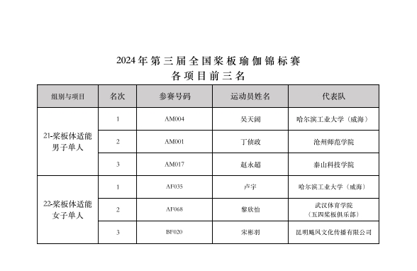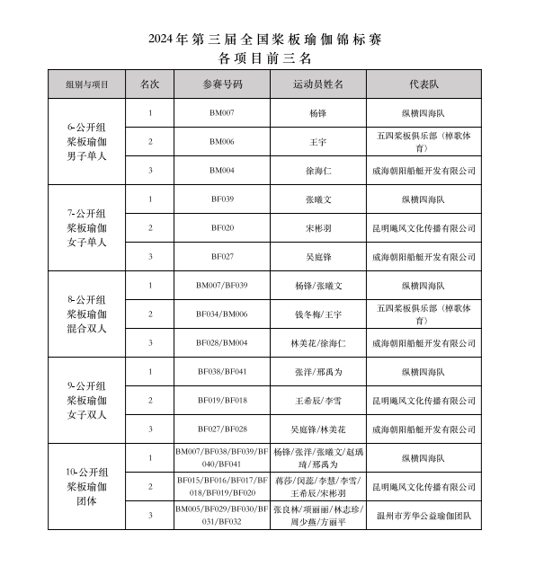 最終經(jīng)過(guò)為期兩天的激烈競(jìng)賽,“意爾康杯”2024年第三屆全國(guó)槳板瑜伽錦標(biāo)賽共決出槳板瑜伽、持槳瑜伽、槳板體適能等3大類(lèi)共22項(xiàng)比賽各項(xiàng)前三名的獲獎(jiǎng)名次。