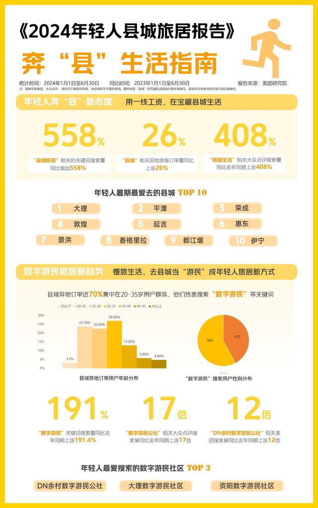 美團(tuán)近期發(fā)布的《2024年輕人縣城旅居報(bào)告》(下稱《報(bào)告》)顯示,今年暑期,大理、平潭、榮成、敦煌、延吉為年輕人最愛去的縣城。這些年輕人熱衷搜索“數(shù)字游民”“旅居”等關(guān)鍵詞,“數(shù)字游民公社”大眾點(diǎn)評(píng)搜索量同比去年同期上漲17倍。