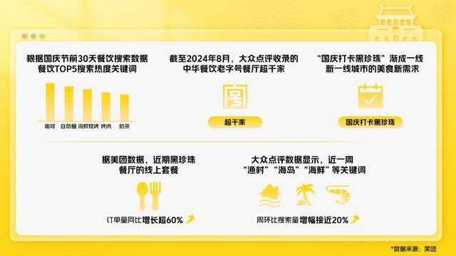 “國慶打卡黑珍珠”漸成一線、新一線城市的美食新需求。據(jù)美團(tuán)數(shù)據(jù)顯示,近期黑珍珠餐廳的線上套餐訂單量同比增長超60%,深圳、福州、廣州地區(qū)提前一周預(yù)訂國慶假期黑珍珠餐廳座位的訂單量同比去年增長均超過2倍,南京、無錫增幅緊隨其后。數(shù)據(jù)顯示,20-30歲的消費(fèi)者旅行時更喜歡打卡美食市集,為此一些城市還聯(lián)合平臺線上線下打造美食市集等消費(fèi)新業(yè)態(tài)。