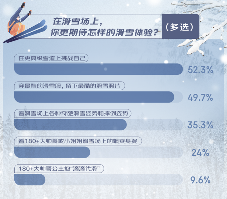 滑雪運(yùn)動(dòng)的持續(xù)“擴(kuò)圈”,也讓滑雪愛(ài)好者們對(duì)于滑雪體驗(yàn)的期待日益多元。超半數(shù)人希望在更高級(jí)的雪道上挑戰(zhàn)自我,感受速度與激情的碰撞;有49.7%的人期待穿上最酷的滑雪服,留下最炫的滑雪照片;還有24%的人表示來(lái)雪場(chǎng)期待看到帥哥、美女的颯爽滑雪身姿。