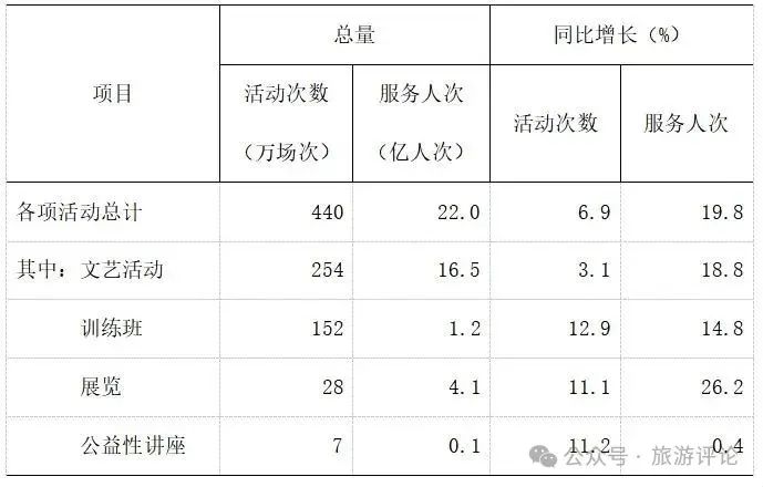 全年全國群眾文化機構(gòu)共組織開展各類文化活動440萬場,同比增長6.9%;服務(wù)22億人次,同比增長19.8%。