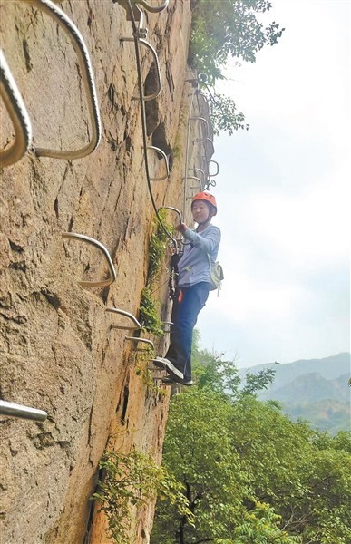 崔女士熱愛徒步,這次是跟隨徒步群一起參加飛拉達(dá)體驗(yàn)活動(dòng)。她記得,剛剛站上幾米高的巖壁回頭望下去時(shí),心里還是“咯噔”了一下,有些發(fā)怵。“剛開始要調(diào)兩個(gè)鐵扣時(shí)我有些慌,越慌越怕,后來操作熟了,發(fā)現(xiàn)始終有一個(gè)扣子在鋼絲上,安全感一下子就上來了。”