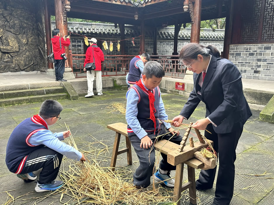 劉瑞龍紅軍小學(xué)的學(xué)生正在體驗(yàn)編織紅軍草鞋的過(guò)程。新華社記者趙一帆 攝