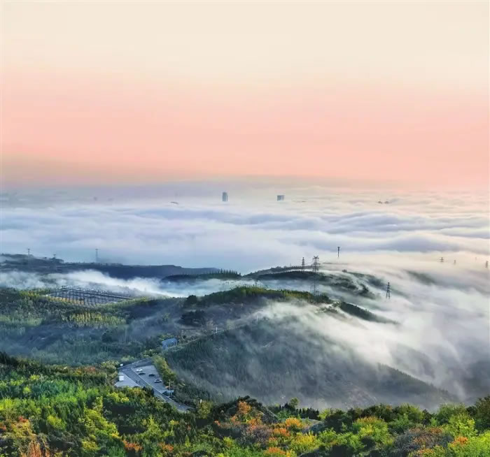 清晨6時許,市民高勁鵬與朋友驅(qū)車前往西山萬畝生態(tài)園。沿途霧氣彌漫,山路蜿蜒間,紅黃綠相間的植被頻頻躍入眼簾,偶有靈動的松鼠從山路旁躥出又疾速消失在馬路對面,遠處山巒影影綽綽,“人在畫中游”的韻味十足。汽車快抵達山頂時,眼前的濃霧突然消散,淡藍色天空下,云海如流水般在城市上空鋪開。遠處,云層翻涌似海浪;近處,沿山霧帶若玉帶流動,高壓電線塔頂端與零星高樓在霧中時隱時現(xiàn)。