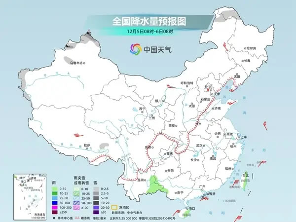 具體來看,今天,新疆北疆北部和南疆西部山區(qū)、內(nèi)蒙古東北部、黑龍江西北部、西藏東部等地部分地區(qū)有小到中雪或雨夾雪,其中,新疆北疆北部等地有大雪。貴州西南部、云南東部、廣西西部、海南島、臺灣島等地部分地區(qū)有小雨。