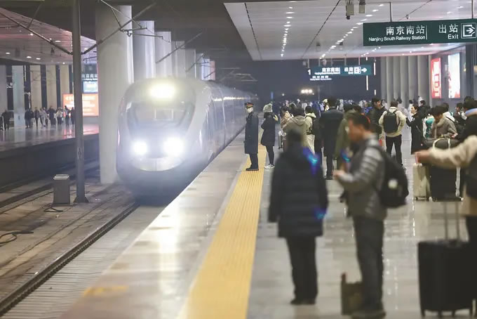 從1月26日零時(shí)起,全國(guó)鐵路實(shí)行新的列車運(yùn)行圖,調(diào)圖后,圖定旅客列車較原圖增加243列。京滬高鐵標(biāo)桿列車G25次迎來了“瘦身”升級(jí):這趟京滬間最快高鐵取消原有5個(gè)停靠站,僅設(shè)南京南站唯一經(jīng)停點(diǎn)。圖為當(dāng)日晚,旅客在南京南站準(zhǔn)備乘坐G25次列車。(陳儼 攝)