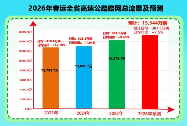 2026年春運(yùn)將于2月2日開始,3月13日結(jié)束,共計40天。春節(jié)假期小型客車免費(fèi)通行時間為2月15日至2月23日。省高速公路路網(wǎng)運(yùn)行監(jiān)測指揮中心研判,春運(yùn)40天全省高速公路出入口總流量將達(dá)到15344萬輛,較2025年春運(yùn)增長7.5%;日均流量383.5萬輛,為平日流量的1.6倍,車流總量有望創(chuàng)歷史新高。