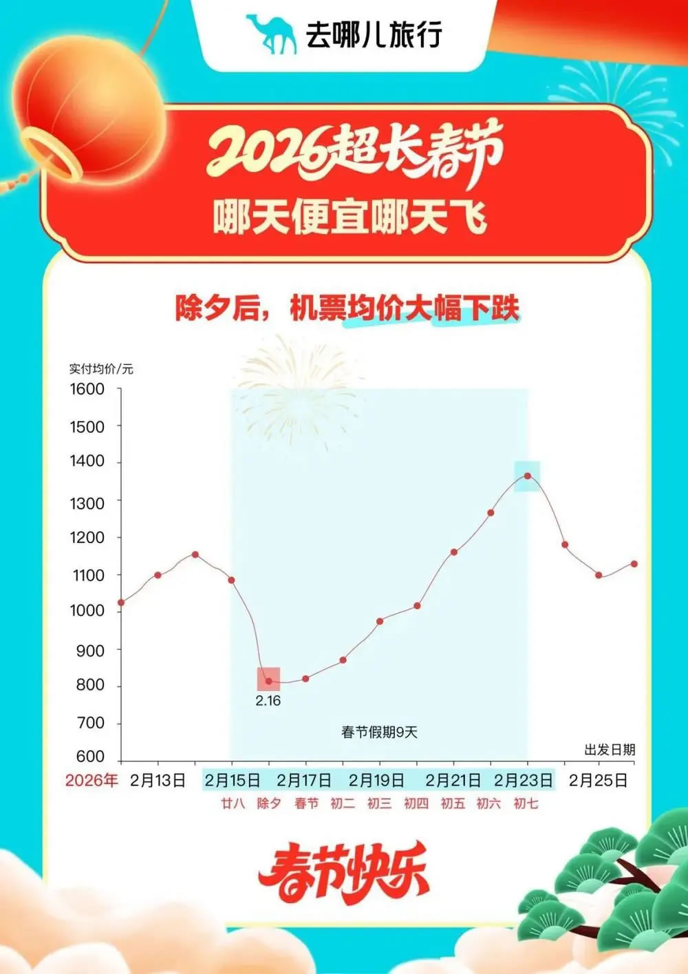 另?yè)?jù)去哪兒旅行大數(shù)據(jù),進(jìn)入2月9日(農(nóng)歷臘月二十二)節(jié)前一周,預(yù)訂機(jī)票出行的旅客量就開(kāi)始逐日增加,到2月14日(二十七)達(dá)到節(jié)前高峰。機(jī)票價(jià)格則跟出行量成正比,到2月15日(二十八)春節(jié)假期第一天,機(jī)票價(jià)格開(kāi)始回落,2月16日(二十九,即除夕)降至節(jié)日期間最低點(diǎn),17日-19日機(jī)票價(jià)格都相對(duì)劃算。