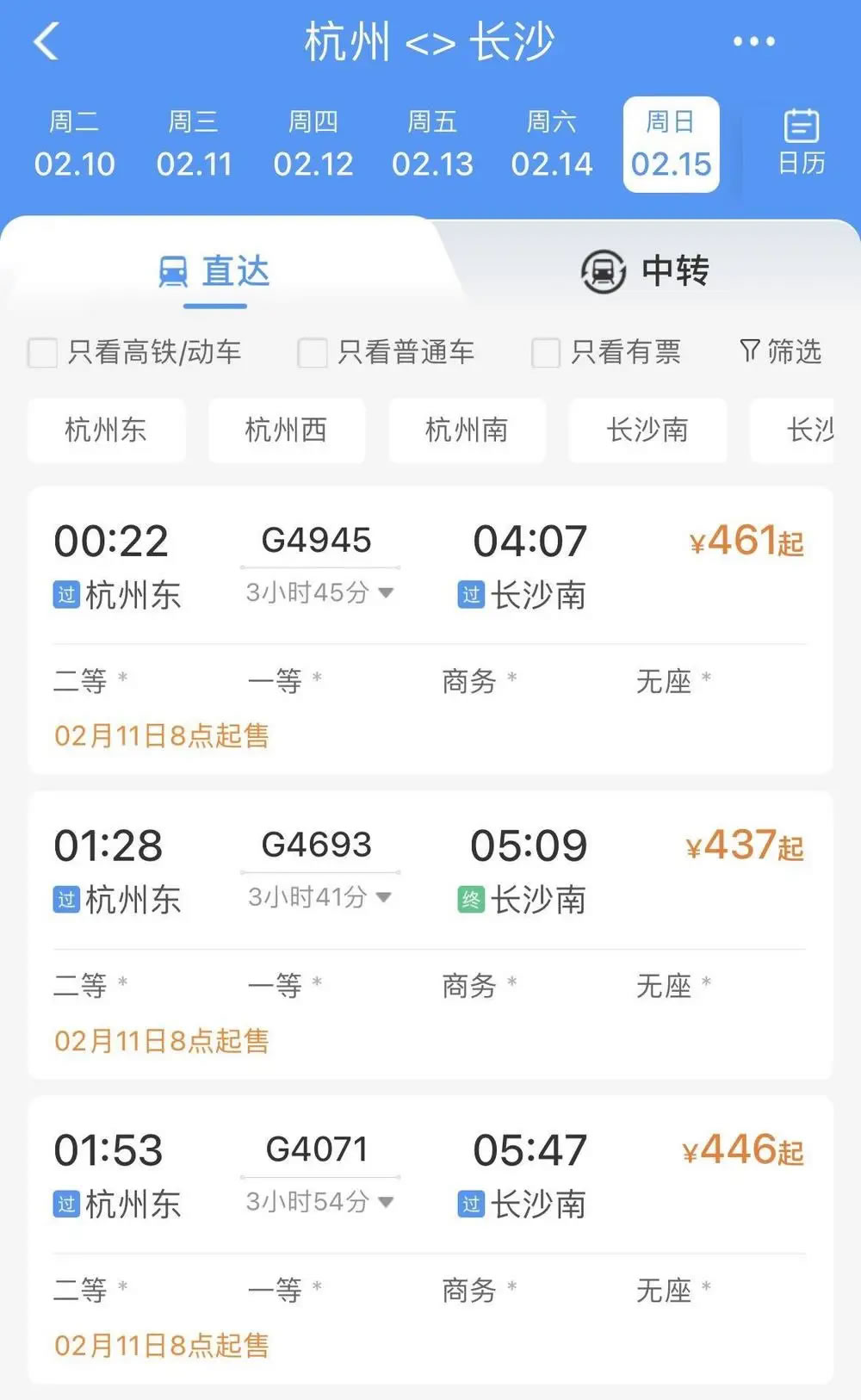 比如,2月15日杭州前往武漢、長沙、南昌、貴陽等地,無論是普速列車還是動(dòng)車組列車,當(dāng)天所有車次已經(jīng)基本全部售罄,只剩極個(gè)別車次硬座、無座席位還有余票。