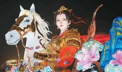 敘事主題的豐富,讓彩燈成為講述中國故事的載體。180米長的《木蘭傳奇》燈組步道上,花木蘭的颯爽英姿與家國大義徐徐鋪展,傳統(tǒng)人物的精神內(nèi)核在現(xiàn)代光影技藝演繹下直抵人心。抬眼望去,全長210米、高達(dá)32米的鯤鵬燈組震撼全場,“鯤鵬展翅”的視覺奇觀與當(dāng)代載人航天、深潛等場景光影交融。福祿廣場,藻井如蓮花般旋轉(zhuǎn),光影“福”字“從天而降”落入游客掌心,讓“伸手接福”從“吉祥話”變成可觸碰的溫暖記憶。